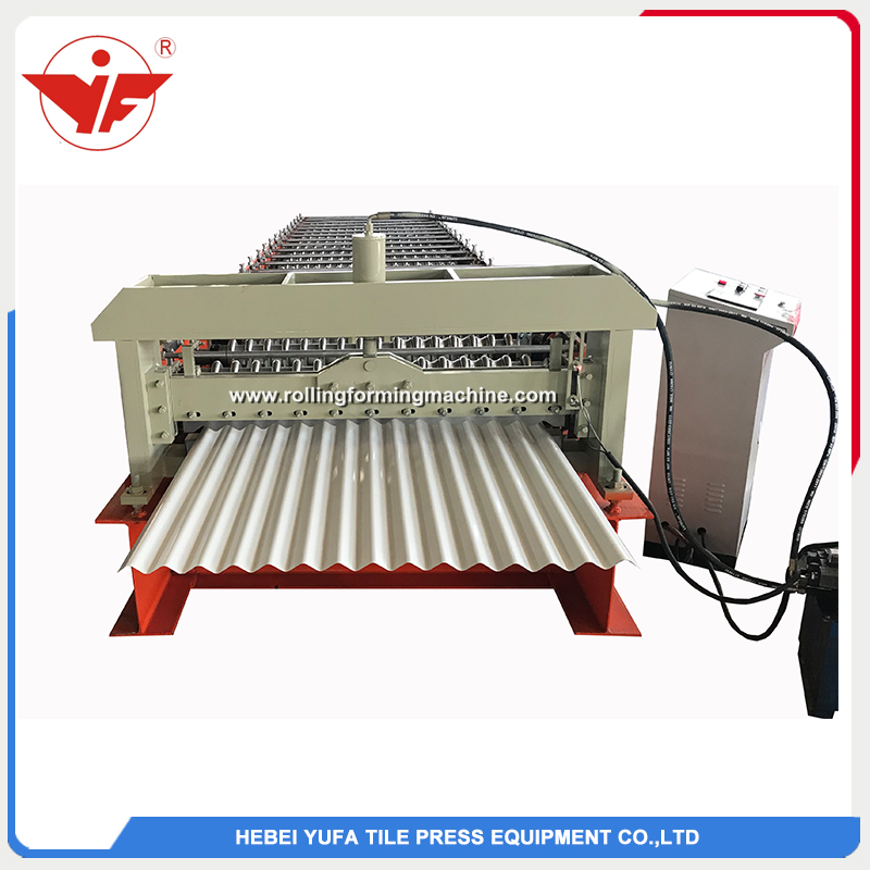 1.Description of corrugating colour coated roofing plate roof panel rolling machine The complete corrugated roofing sheet making machine line includes de-coiler, main machine, computer controlling system and run out tables. Our machines are equipped with a computer controlling system. We simply program the pieces and length we need in the computer and the wave panel machine produces it automatically. The machines are easy to operate and running stable. 2.Corrugated panel profile:(customized...