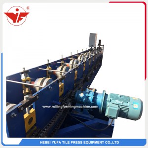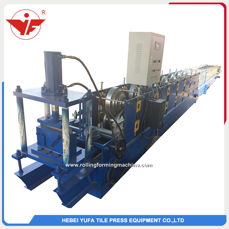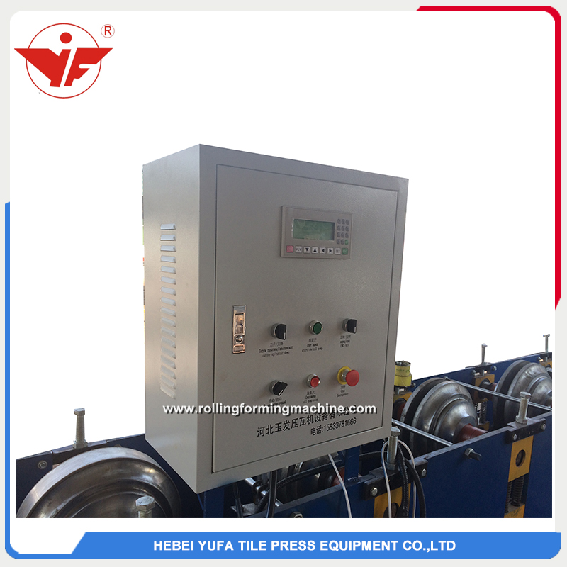 Metal water gutter roll forming machine include one set 5 ton manual decoiler, feeding table, roll forming machine , hydraulic cutter and receiving table.Machine is controled by Delta PLC control system, we also have Mitsibishi PLC for option.